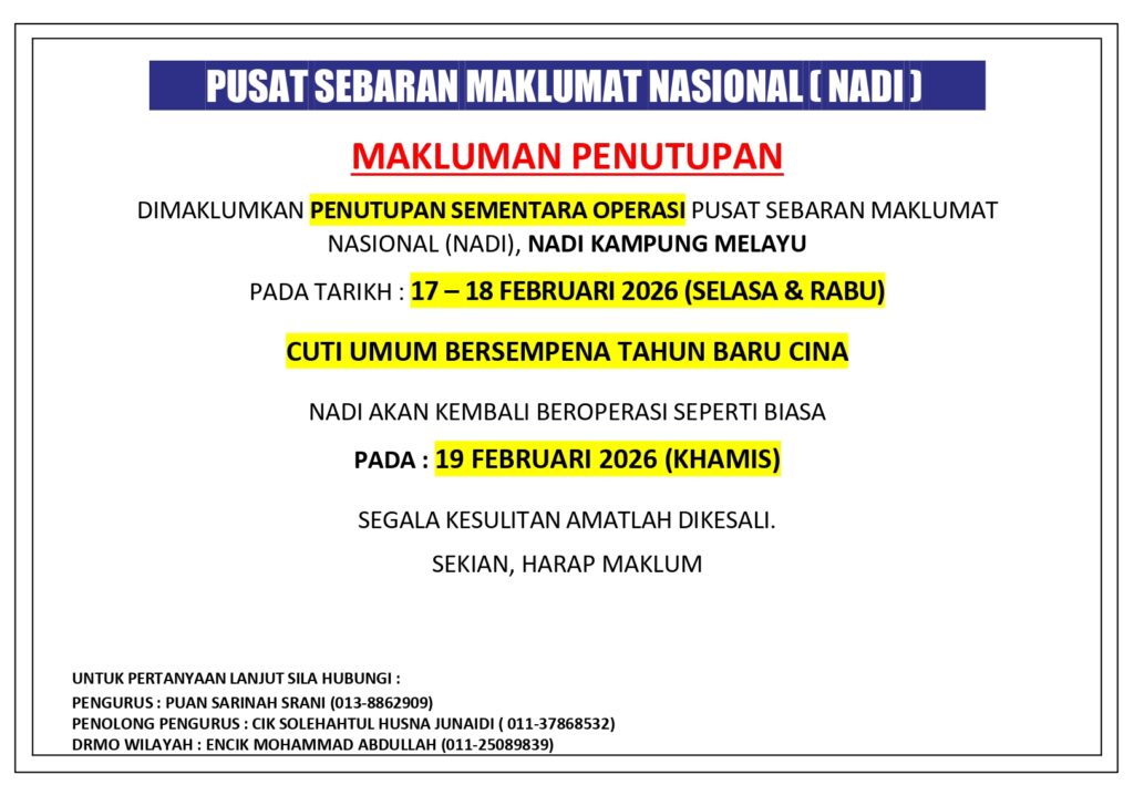 Dimaklumkan bahawa 𝐏𝐮𝐬𝐚𝐭 𝐒𝐞𝐛𝐚𝐫𝐚𝐧 𝐌𝐚𝐤𝐥𝐮𝐦𝐚𝐭 𝐍𝐚𝐬𝐢𝐨𝐧𝐚𝐥 (𝐍𝐀𝐃𝐈) 𝐊𝐚𝐦𝐩𝐮𝐧𝐠 𝐌𝐞𝐥𝐚𝐲𝐮 akan ditutup sementara sempena 𝐂𝐮𝐭𝐢 𝐔𝐦𝐮𝐦 𝐓𝐚𝐡𝐮𝐧 𝐁𝐚𝐫𝐮 𝐂𝐢𝐧𝐚 pada ketetapan berikut: